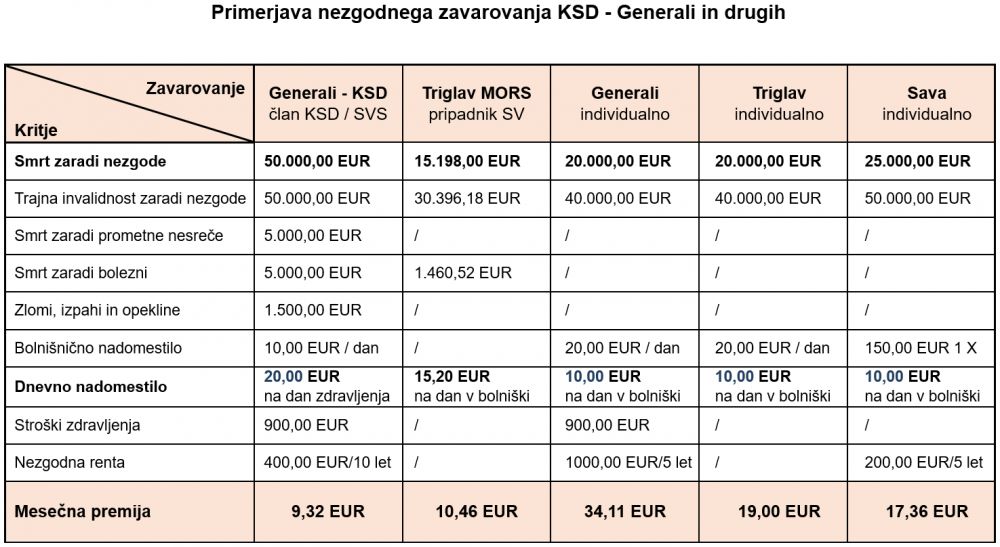 Za primerjavo smo pripravili pregled možnih nezgodnih zavarovanj pri drugih zavarovalnicah in pri zavarovalnici GENERALI individualno in kot za člana KSD. Primerjava možnih nezgodnih zavarovanj: